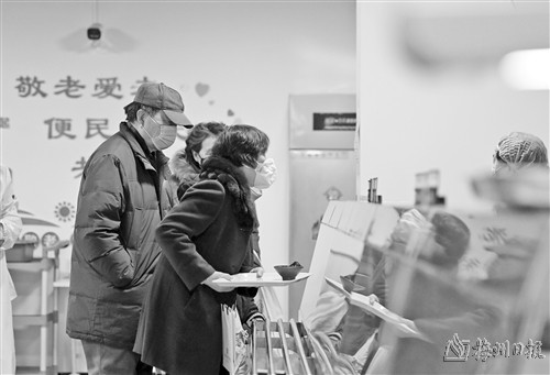 图为老人在天津市和平区南营门街道的老年人“智慧食堂”取餐(2月10日摄)。
