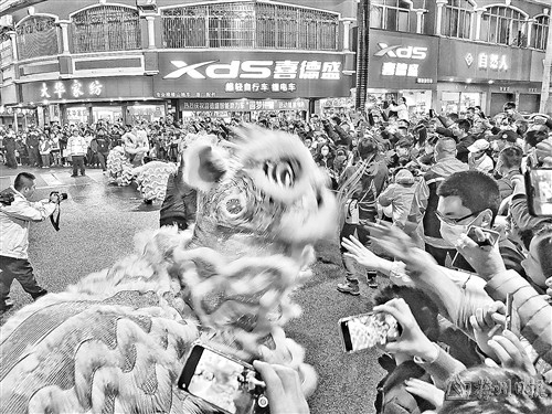 2月5日(正月十五),梅江区“嘉应古城”元宵展演活动在梅城江北举行,现场“龙腾狮跃”,气氛热烈,吸引了众多市民游玩观赏。(吴忠 摄)
