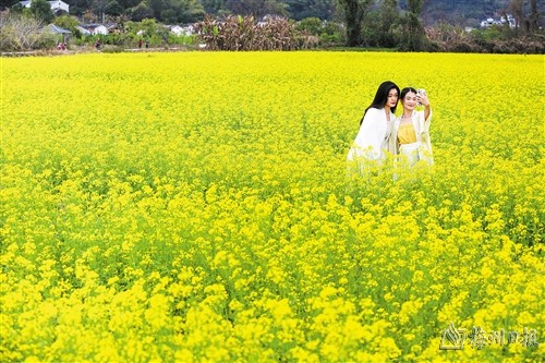 据了解,这是侨乡村利用冬日闲置农田种植的200余亩油菜花,日前已进入盛花期,花期还将持续一个月。“灿烂的油菜花海吸引了游客前来赏花休闲,使‘春赏花’成为侨乡村一张靓丽的生态名片,带旺了村里的人气和特色农产品销售。”侨乡村党支部书记潘增明说,近年来,侨乡村积极探索古民居保护和乡村旅游资源开发,充分挖掘整合古村落丰富的人文、自然和生态资源,以“陌上故庐,客归侨乡”为主题打响“自在侨乡”乡村特色旅游品牌。