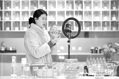 2月11日,河北省河间市一家工艺玻璃制品生产企业的工作人员在通过网络直播推介产品。