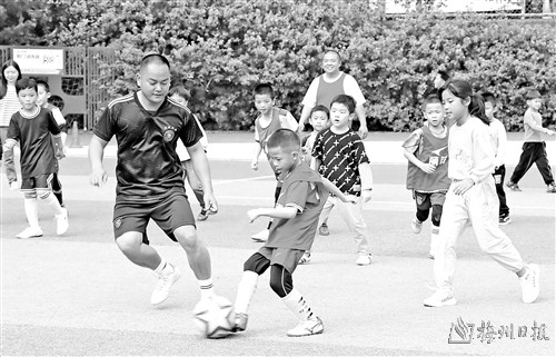 昨日上午,梅县区丽群小学内热闹非凡,记者走进球场看到,众多小孩在家长的陪伴下纷纷参加各项游戏活动,笑声和欢呼声此起彼伏。据了解,这是由梅州市嘉应新匠足球俱乐部举办的足球亲子活动。