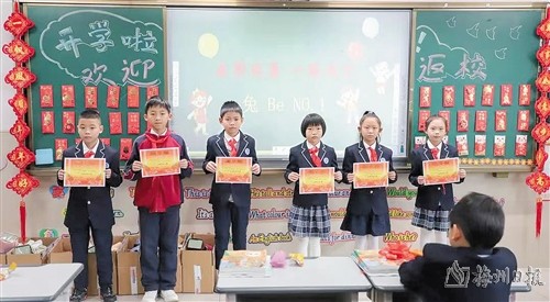 梅州市外语实验学校在开学第一天为上学期表现优异的学生颁发奖状。(学校供图)