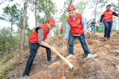 植树现场,马正勇、王晖、杨朝晖、王庆利等市领导,与广大干部职工、学生志愿者一起挥锹铲土、扶树填坑、踏土夯苗、提桶浇水……每一道工序都做得一丝不苟,合力栽下一株株绿植。经过大家辛勤劳动,共种下红椎、楠木等珍贵树木和南山枣等特色树种共计1628株。一棵棵新栽下的树苗昂然挺立、错落有致,静待新芽吐绿。