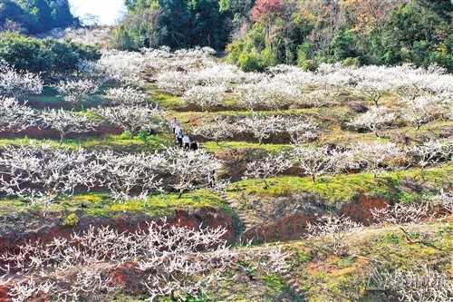 记者来到城北镇群益村横坑,漫山的李花相继开放,一团团、一簇簇的花朵宛如白雪,像给山坡穿上了雪白的新衣,与蓝天白云交相辉映,构成一幅美丽乡村田园画卷。(如上图,高讯摄)据了解,群益村积极盘活资源,发动村民在横坑种植了1000多亩李树,品种以三月李、三华李为主,李花花期较短,立春前后为最佳观赏期。“今年的李花开得特别好,吸引不少市民前来观赏。”种植有十多亩李树的村民古志立告诉记者,李树有较好的经济效益,春季可赏李花,夏季可收李果,不仅丰富了市民的假期生活,也有效带动了村民增收致富。