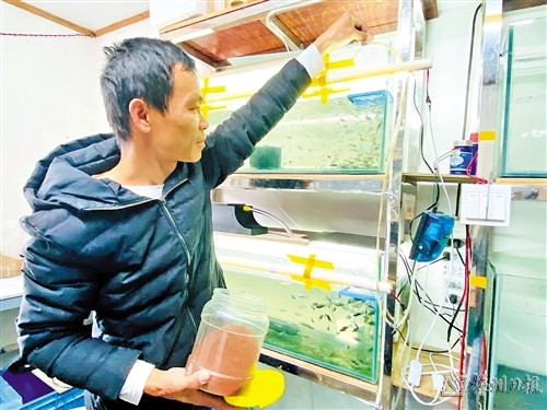 何威是一名80后,主要从事装修工作,利用装修淡季在家养殖中国斗鱼。“中国斗鱼在我们梅州地区叫‘旁皮腊’,是最受欢迎的观赏鱼种之一,以前田间小溪随处可见,现在却难寻踪迹,是不少人儿时的记忆。因为喜欢养鱼,于是决定利用装修淡季在家自己创业,开始养殖中国斗鱼。”何威说,从鱼苗的繁殖到销售,都是他自己一个人亲力亲为。