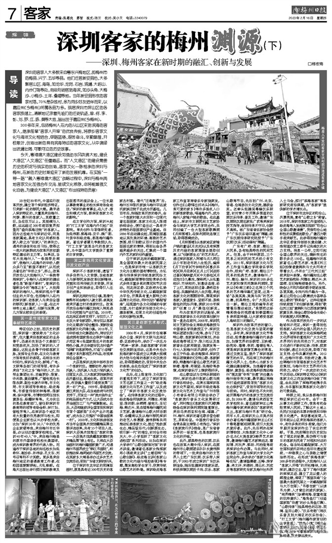 转眼之间,我从客都梅州到特区深圳已近40年。由于一直从事文化调研工作,使我有机会经常深入民间,了解这片土地上先民们创造的丰厚的物质和非物质文化遗产。我惊喜地发现,几百年前从山区来到海滨的客家人中,有许多我的同乡前辈,他们为早期开发深圳作出了突出的贡献。于是,恍若隔世的历史犹如有了现实的场景,我仿佛可与昔日的客家先民有了对视和对话的机会。每当站在鹤湖新居、大万世居和凌氏宗祠这些旧日遗址面前,一种敬畏之心与崇敬之情便油然而生。在形成“滨海客家”300多年的进程中,大批梅州人以“客家人开埠”的开拓精神,扎根深圳,建功立业,留下了梅州客家的深深足迹、建立了足以傲人的辉煌业绩,涌现了“围屋双雄”(全国最大客家民居之一的鹤湖新居与大万世居)、“书香世家”(以读书为荣、人才辈出的凌氏家族)、“商界精英”(纵横商海、致富有道的坑梓黄氏)、“海角鱼灯”(创造国家级“非遗”的沙头角鱼灯舞)、“山歌传承”(独具特色的石岩、观澜、盐田山歌)、“汉乐奇葩”(将汉乐普及到大湾区的汉乐协会)、“打工文学”(梅州籍作家首创的文学流派)、“特色小镇”(闻名全国的大芬村、观澜小镇、甘坑小镇)等,从中可看到深圳与梅州文脉相通,历史源远流长。