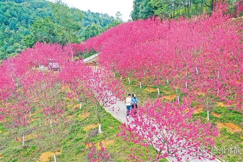 目前,麓湖山景区种植了上万株观赏性的杏花,杏花林经过改造提升后,变得更为壮观。“今年的杏花开得比较早,花期将持续至二月底。”麓湖山景区相关负责人温玉婷介绍道,景区还在时花广场和九曲花街种植了石竹等时花,现在也进入了盛花期,前来赏花的游客络绎不绝。