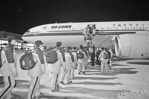 图为2月16日,中国救援队队员在土耳其阿达纳国际机场乘坐国航包机回国。