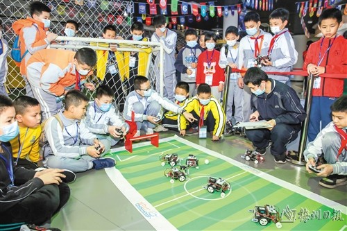 记者在现场看到,竞赛项目分为儿童创意构建挑战赛、创意编程竞赛、3D打印创意设计赛、机器人足球赛(如右图,吴腾江摄)、无人机环绕赛道穿越赛、小小发明家智慧生活创意现场制作赛等6项。参赛选手在各自赛区有条不紊地调试和操作机器,各种创新思维相互碰撞,场面十分火热。现场还设置有专门的成果展示区,邀请了来自嘉应学院等单位的14名专业评委对此次比赛前期已完成的科幻画及科创作品进行现场评审。AI智能升降支架、火焰感应排烟器、智能客家花灯、“定水神针”浇水器、高架事故感应器……充满奇思妙想的科幻画和别出心裁的科创作品,让人目不暇接。