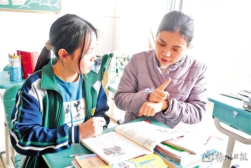 春日的下午,和煦的阳光透过玻璃窗爬进了梅州市特殊教育学校听障部高二(1)班。教室很安静,一位女老师正用夸张的面部表情与挥舞的双手讲解着语文知识点。“老师,什么是论点?我还是不懂。”有位学生比划着手势向其示意,她就停下来,俯到学生身旁,逐字逐句帮助学生理解课文。