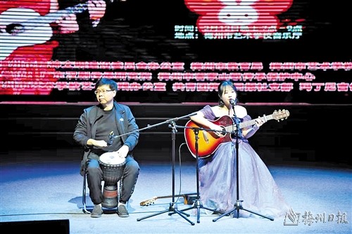 在音乐会现场,“龙凤传琪”组合的黄家琪精彩演绎了流行歌曲改编的吉他独奏《我和我的祖国》、中国风古典吉他独奏《春江花月夜》、客语山歌五句板弹唱《新客家妹子顶呱呱》等节目。她将吉他独奏、重奏、民谣、客家山歌等不同流派的跨界演奏和演唱融为一体、相得益彰,特别是吉他演奏和客家山歌的融合,让听众感受客家山歌的创新演绎,悦耳又悦心。“这次音乐会的举办,起源于我们和市艺术学校的特殊渊源。我的爷爷是市艺术学校(原梅县地区戏剧学校)的创办负责人之一,爸爸也是市艺术学校的校友,所以我想来学校看看,也和师生们一起分享音乐,相互学习交流。”黄家琪说。