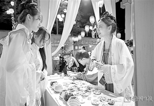 摊主(右一)在海口日月广场的古风市集售卖商品(2月19日摄)。
