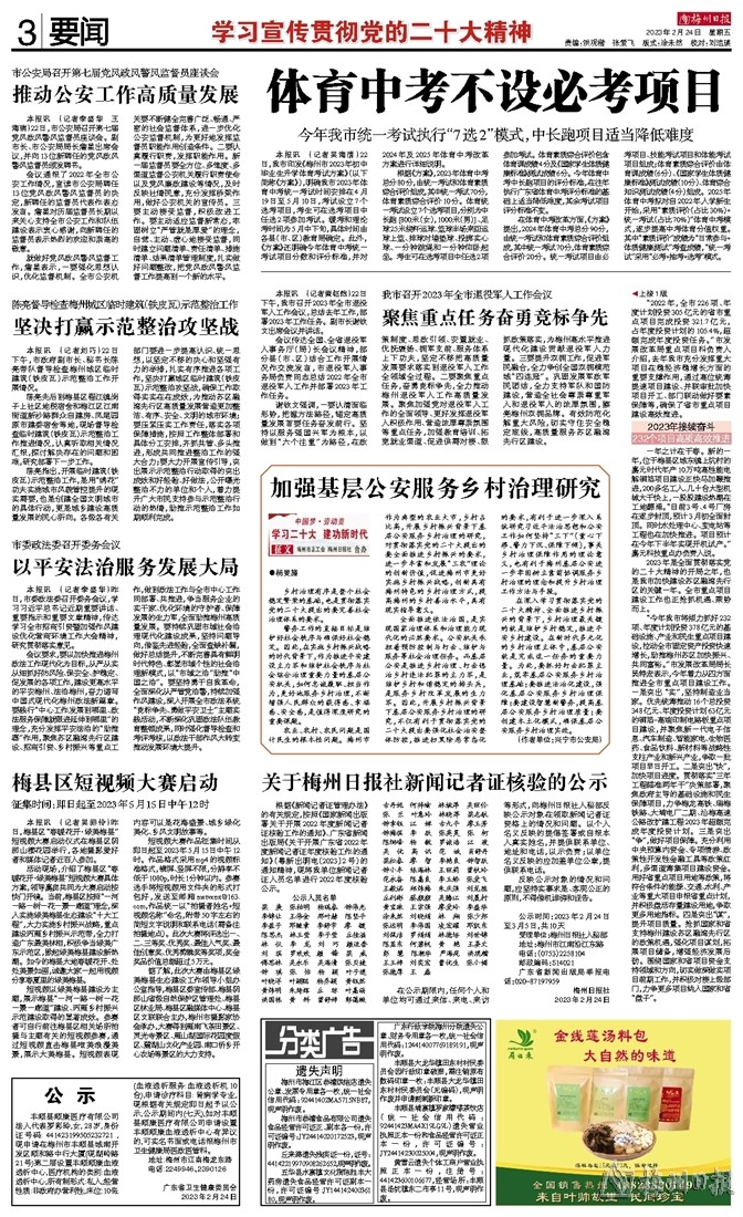 本报讯 (记者吴海清)22日,我市印发《梅州市2023年初中毕业生升学体育考试方案》(以下简称《方案》),明确我市2023年体育中考统一考试时间安排在4月19日至5月10日,考试设立7个选考项目,考生可在选考项目中任选2项参加考试。缓考和理论考时间为5月中下旬,具体时间由各县(市、区)教育局确定。此外,《方案》还明确今年体育中考统一考试项目分数和评分标准,并对2024年及2025年体育中考改革方案进行详细说明。