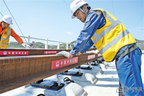 2月23日,在汕尾东冲特大桥铺轨现场,施工人员辅助轨道铺架车铺设广汕铁路正线最后一组500米长轨。