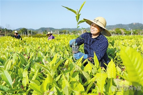 挖坑、扶树、填土、浇水……记者日前来到梅县区梅南镇轩中村的梅畲快线景观提升工程建设现场,只见十多名造林工人正游走在山坡上,忙着植树添绿。“我们大年初八就开工了,目前已完成200多亩景观提升和造林工作。”该工程现场施工负责人介绍说。记者随后驱车来到梅江区长沙镇下罗村苗圃场,见到的也是一派繁忙的景象:红椎、火力楠等苗木整整齐齐码在一起,等待装车运往造林点,数名村民正忙着炼苗(如上图,高讯摄)。“我省提出全力推动绿美广东生态建设后,市场对红椎、火力楠、木荷等阔叶树种的需求更大了,开春前我们就陆续接到了不少苗木订单。”该苗圃场负责人、梅州市勇泰林业发展有限公司总经理王勇居告诉记者,苗圃场现有苗木100多万株,今年开春以来已出苗约20万株,比往年同期相比出苗量增长约两成。