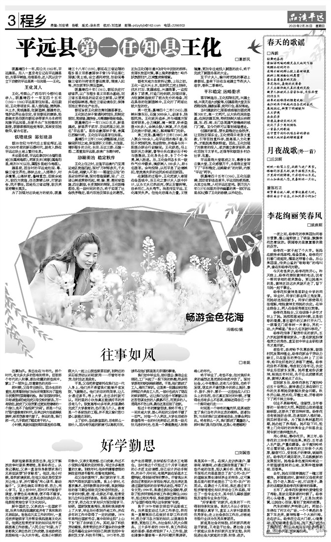 王化上任之时,正值平远境内乃至周边地区流寇四起,面对“万树郁参天,千夫夹马前,鸿蒙人不到……蜀道空云险”的恶劣自然环境,面对倭寇猖獗,闽、广、江诸山贼遂乘势而起,南、赣、惠、潮间皆盗窟,四出剽掠,长吏莫制的局面,王化励精图治,经一段时间的努力,终于实现了社会秩序稳定,县内百姓安居乐业的愿想。正如王化《春日遣兴》诗句中说到的那样:穷居长抱匡时策,事上肩来敢避危?岭外妖氛频扫穴,江南繁庶渐修篱。