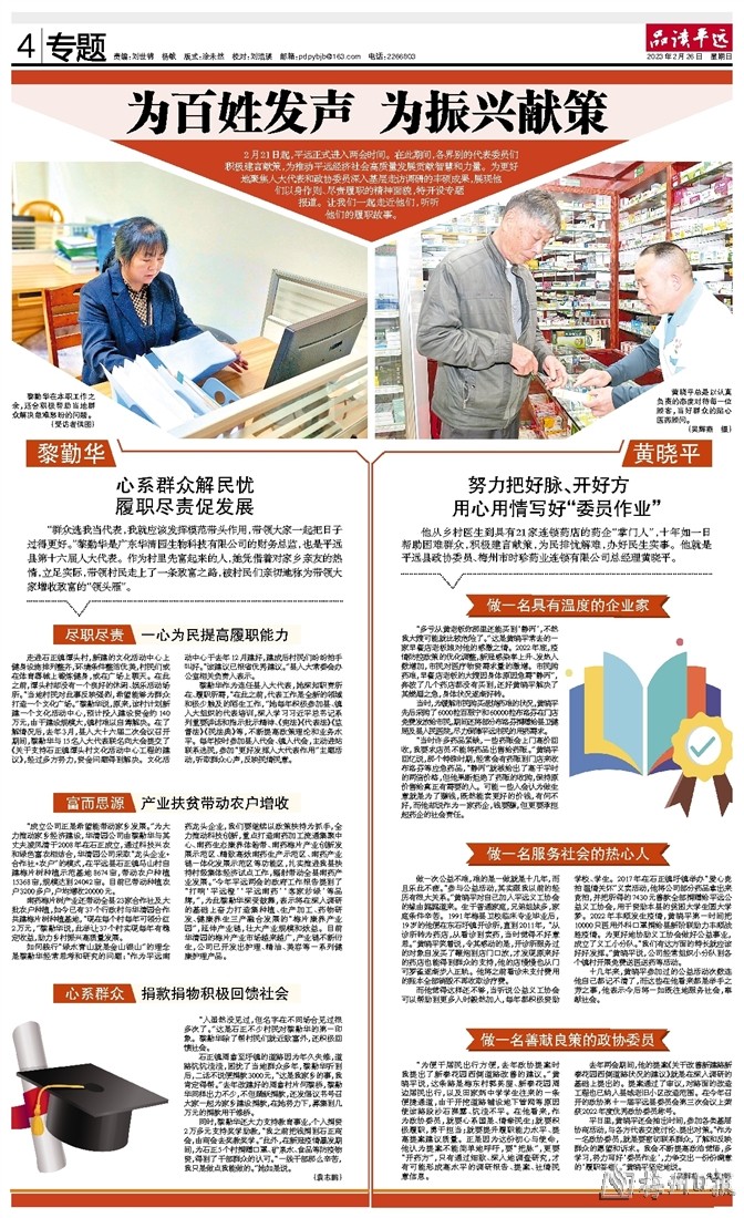 他从乡村医生到具有21家连锁药店的药企“掌门人”,十年如一日帮助困难群众,积极建言献策,为民排忧解难,办好民生实事。他就是平远县政协委员、梅州市时珍药业连锁有限公司总经理黄晓平。