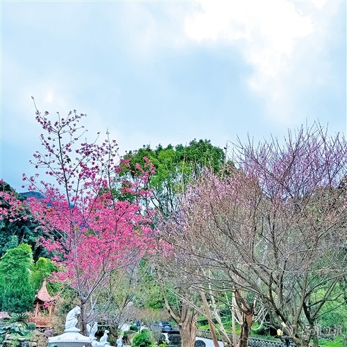“处处山樱花压枝”。在通往灵光寺的路上,不时看到已经开放的樱花。在放生池边,一株樱花,一株梅花,紧挨一起,花儿齐绽放,难得的同框。远远地望到,在茶田景区里,一丛丛绿的茶叶,一树树粉的樱花,一派春意盎然。樱花园近期即将开门迎客。古寺+禅茶文化,给了赏花更多的含义。而高山樱花,当数西阳白宫板盖坑了。经过333省道旁大棵的樱花“指路牌”,驾车沿着崎岖的山路蜿蜒而上,峰回路转,各色樱花在山窝里盛放,花满枝头,红似火焰,粉似霞朵。很多游客流连于樱花树下,每每捕捉精彩,把美丽定格。眺望云天远山,自是神清气爽。