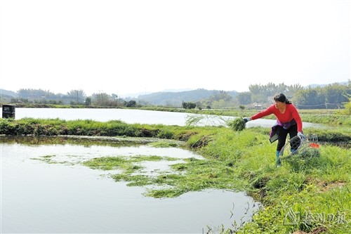 左图为村民在给鱼投喂草料。(吴丽伶 摄)