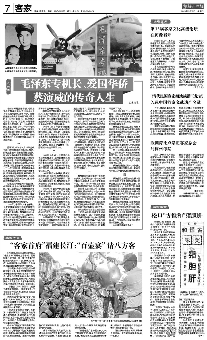 梅州丰顺籍爱国华侨、毛泽东专机长蔡演威先生于2023年1月19日在北京逝世,享年97岁。蔡演威曾担任中央首长专机飞行大队大队长,从1957年到1961年,主要为毛泽东、刘少奇、周恩来、朱德等国家领导人开专机,是一位为祖国的航空事业“绝密飞行”了十多个春秋的客家英雄。在为毛泽东主席开过专机的所有三位机长中,蔡演威先生是“开过最多次、时间最长、信任度最高的”,为我国航空事业作出了卓越贡献。