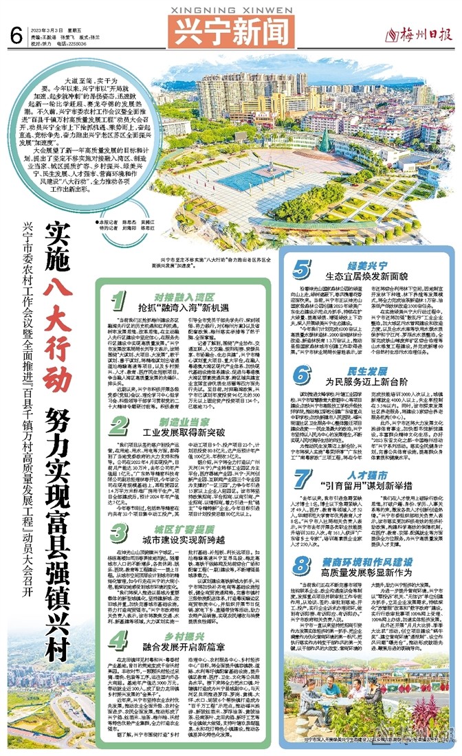 大会展望了新一年高质量发展的目标和计划,提出了坚定不移实施对接融入湾区、制造业当家、城区提质扩容、乡村振兴、绿美兴宁、民生发展、人才强市、营商环境和作风建设“八大行动”,全力推动各项工作出新出彩。