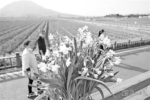 2月28日,游人在漳州圆山水仙花发展有限公司水仙花种植基地参观。