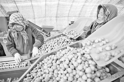 工作人员在宁夏西吉县恒丰马铃薯种薯脱毒繁育中心分拣马铃薯原原种。