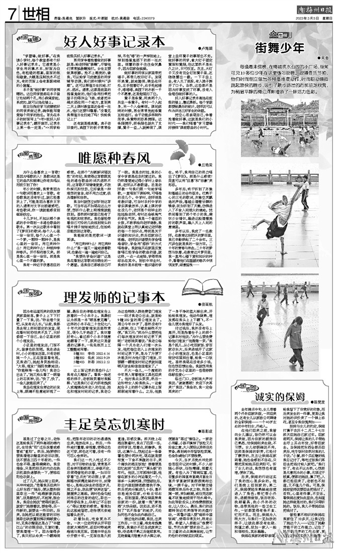 付过钱后,我并没有马上离开,而是指着台子上的那个记事本对他说:“为什么要免费给他们理发?”他微微一笑:“我是个孤儿,从小吃百家饭、穿百家衣长大,后来进城开了这家小小的理发店,也是小区里的街坊邻居照应着,给我一口饭吃。虽然我现在没有多少钱,但也想回馈社会。我就想用我的手艺为小区里的一些弱势群体献些爱心……”