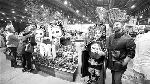 3月4日,在美国费城花展上,前来参观成都展园的美国民众与川剧演员合影。