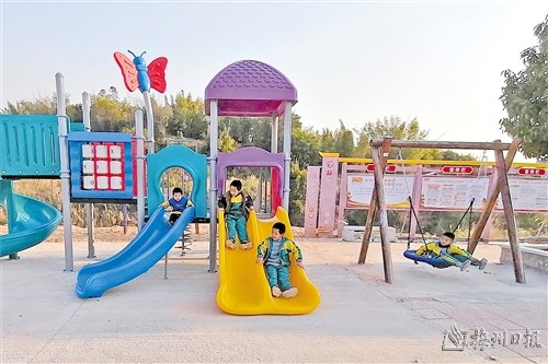 美丽的彩色蝴蝶、帅气的小木马、精巧的彩虹梯……可爱的孩子们从里面钻进钻出,灵活的身姿沿着滑梯下方的滑管钻、爬、跳、穿,快乐滑行,欢笑声萦绕耳畔,场面十分欢腾(如图)。7岁的小朋友明乐一边玩,一边开心地和记者分享:“不用等爸爸妈妈回来带着去城里的游乐园,可以直接在村里的小乐园快乐玩耍了!”