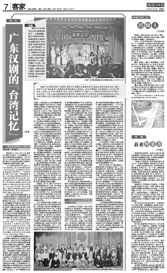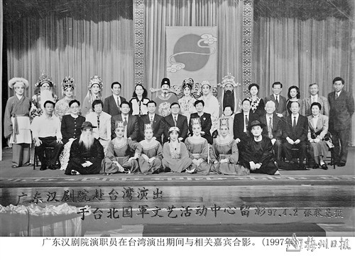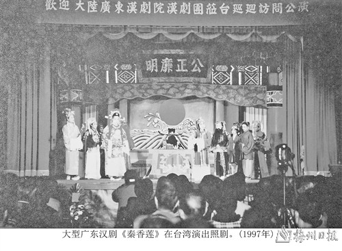 时光荏苒,岁月如歌。中华人民共和国成立后,党和政府十分重视地方剧种的生存状态和传承发展。广东汉剧作为具有三百多年历史的皮黄剧种,迎来了新生和繁荣的岁月。一大批优秀剧目,在不同时期应运而生,在祖国文艺百花园中争妍斗艳;一代又一代广东汉剧艺术人才茁壮成长,在舞台上展示辉煌人生。改革开放,让国际国内文化交流繁花似锦,海峡两岸,同宗同文,血脉相连。距民国时期赴台巡演七十多年后的1997年4月1日,广东汉剧院应台湾苗栗荣兴客家采茶剧团的邀请,在团长古小平、副团长梁素珍的带领下,一行34人踏上宝岛,赴台湾作文化艺术交流。这次赴台演出,是对台湾苗栗荣兴客家采茶剧团1993年应邀参加海峡两岸戏剧节,福建省戏剧汇演及广东省梅州市文化交流演出的回访。1993年12月14日,台湾苗栗荣兴客家采茶剧团在梅州百花洲影剧院,为梅州观众表演了《山上采茶》《送金钗》《桃花过渡》《粜酒》等四场戏剧,博得市民赞赏。这里特别值得一提的一个人,就是祖籍客都梅州的郑荣兴先生,他既是台湾戏曲界的知名专家,又在早年间创立了“台湾苗栗荣兴客家采茶戏剧团”。郑先生心怀桑梓,热心公益,毕生致力于海峡两岸文化交流。他对广东汉剧情有独钟,分外赞赏。特别是在推介和传承客家乡土文化方面,作出了卓越的贡献。先生挚诚,令人感怀!
