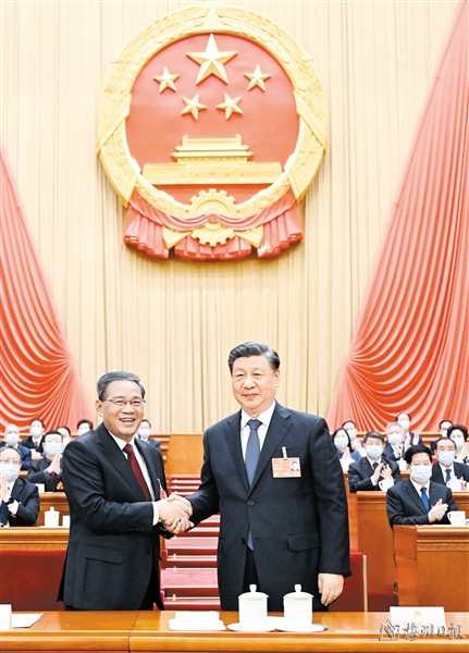 在主持人宣布李强同志为中华人民共和国国务院总理后,全场响起热烈的掌声,李强起身向代表们鞠躬致意。随后,他转向习近平,两人亲切握手,习近平向他表示祝贺。李强又同李克强同志握手,相互致意。