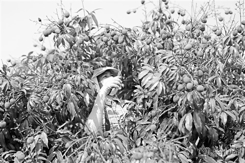 3月12日,农户在乐东黎族自治县万冲镇友谊村内的荔枝基地采摘荔枝。
