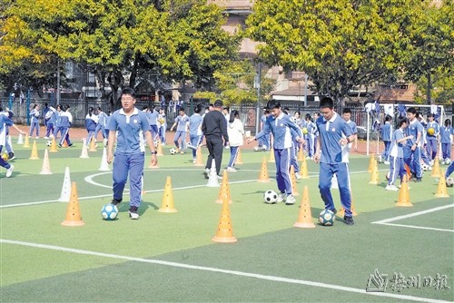 “同学们,热身运动结束后,分组轮换进行体育运动……”日前,记者来到梅州市学艺中学体育场看到,各班学生在体育老师的带领下,有的在练足球绕杆,有的在跳绳,有的在练习仰卧起坐,脸上都洋溢着青春活力。