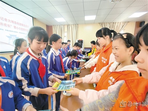 下午,梅州日报社在大埔县桃源镇中心小学举行“手拉手,伴成长”爱心公益赠书活动,来自梅州城区的梅州日报小记者们为大埔县桃源镇中心小学小记者站小记者现场捐赠图书,分享阅读体会,传递书香。梅州日报社党委副书记、总经理梁庚,邓振龙教育公益项目代表邓铭栋,梅州日报社副刊部主任李志奎,大埔县桃源镇中心小学副校长谢德华出席活动。