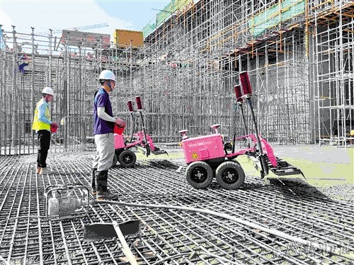 在梅州市医学科学院大楼工程项目建设现场,工人正在浇筑混凝土,两个粉色机器人紧随其后,“走”过的地方,面层已经平整起来。这个“地面整平机器人”,是项目承建单位中建一局在广东使用的首个智能建造装备,也是梅州首个工程作业机器人。