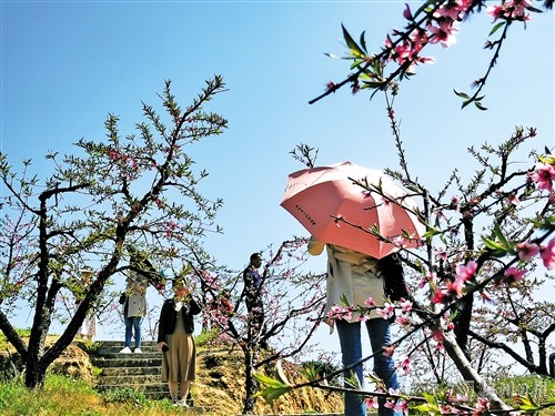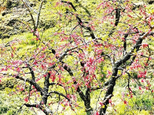一进入八乡山界,映入眼帘的是崇山峻岭,苗竹、树木,层林尽染,在山路拐弯处,偶尔还会见到黄牛成群,一片生态盎然景象。展眼望去,那一片片的山坡上,刚刚睡醒的小草绿嫩绿嫩的,光秃秃的树枝条抽出了新芽,几只小鸟不时地在枝头歌唱,刚刚绽放的花儿,一簇簇的,争妍斗艳。行走在桃花林,一片一片的,一望无际,红的似火,粉的似霞,间种的李树花,新叶与白得像雪的花朵相映成趣……整个桃花林,花儿有的三五朵开放,有的三五簇一群,在一片片绿叶的衬托下,花朵显得娇嫩、鲜艳,一片生机勃勃,引得游人如潮。这万物复苏、百花争奇斗艳的景象,一片春意盎然,把春天都给闹醒了,也把我的心思给闹沸腾了。