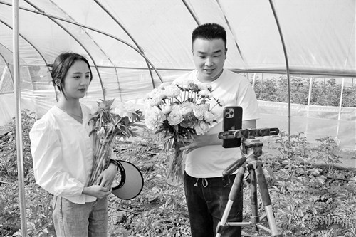 3月14日,在山东省菏泽市牡丹区黄堽镇,两名销售芍药鲜切花的电商主播在芍药种植大棚内进行网络直播销售。