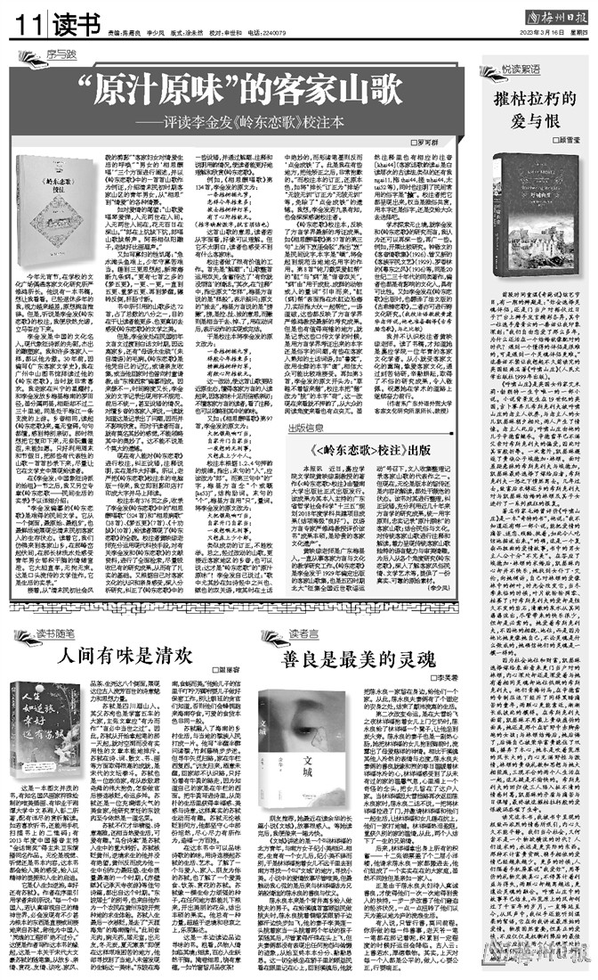 类似成功的订正,不胜枚举。总之,经过改动的山歌,更接近客家地区的乡音,也可以说:这才是“岭东恋歌”的“原汁原味”!李金发自己说过:“歌中尤其妙在如诗经中之兴也、赋也的双关语,唯其时在土话中绝妙的,而形诸笔墨则反而‘点金成铁’了。此是我在有些地方,把他矫正之后,非常抱歉的。”而校注本的订正,还原本色,如将“排长”订正为“排场”“无坡无圳”订正为“无陂无圳”等,免除了“点金成铁”的遗憾。我想,李金发若九泉有知,也会深深感谢校注者。