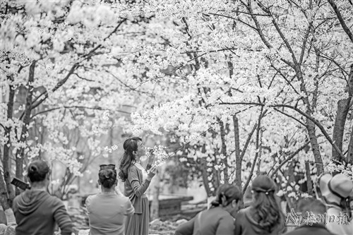 3月15日,游客在湖南省永州市蓝山县湘江源瑶族乡坪源村蓝山谷景区赏花拍照。