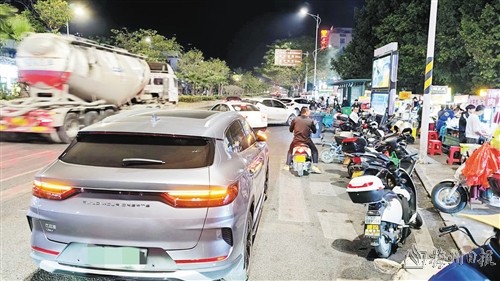 记者发现,嘉应学院西校门左侧设有明显的禁停标识,但摊档周边200米的国道上停满了机动车,其中一些车打着双闪灯,但好些车上并未坐有驾驶员。这些车辆占据着最右侧机动车道,使得原本三车道的道路变成了两车道,一些非机动车和机动车通过该路段时,只能选择中间车道行驶,现场时常还有大车经过,存在较大安全隐患。此外,记者留意到,在西校门对面的路口存在共享单车扎堆停放的现象,使得本不宽阔的道路变得更加拥堵。