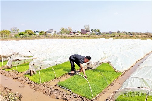 在这个机器旁边,整齐叠放着千余个用薄膜覆盖的秧盘,秧苗小芽在里面湿润的土壤中蓬勃生长着。“我们的育秧机要为麻岭村、河西村等周边村庄的2000多亩地提供服务,再过不久就要开始插秧了,所以最近我们的机器都是昼夜不停运转,以赶上播种的季节。”兴宁市绿达种养专业合作社负责人罗伟超说。