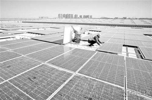 3月16日,工人在唐山市芦台经济开发区一家企业厂房屋顶上安装太阳能光伏发电板。