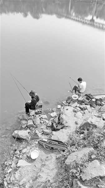 记者走近后看到,在钓鱼爱好者身边除了有钓鱼的用具外,还散落着一些果皮纸屑、矿泉水瓶、饵料袋、烟盒等垃圾(如图,陈坚平摄)。此外,周边水面上也漂浮着生活垃圾。