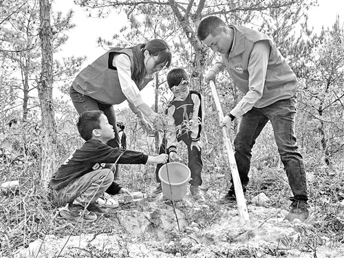 随后,各单位党员志愿者与现场志愿者、亲子家庭一起,手拿锄头、铁锹、水桶等工具,带着树苗上山。大家热情高涨,填土浇水、互相协作,特别是现场的100多对亲子家庭,他们带着小朋友栽下一株株充满希望的树苗,扮靓了这片山地,增添了一道绿色、靓丽的风景线。在不到一上午的时间里,经过连续劳作,一排排整齐的苗木迎风挺立,为春日增添了绿色活力,焕发出无限生机。不少市民告诉记者,此次活动能在孩子的小小心灵间播下迎风而立、向阳而生的信念,传递人与自然和谐共生美好理念,真正让树木植于土、生态理念植于心。