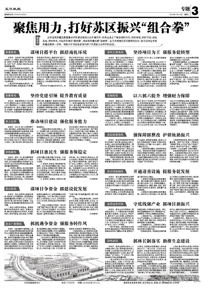 五华县高质量发展暨重点项目建设推进大会日前召开,动员全县上下拿出硬的作风、实的举措、拼的干劲,奋起直追、竞标争先,兴起项目建设“新热潮”,跑出高质量发展“加速度”,全力支持建设苏区融湾先行区,努力迈进全市高质量发展第一方阵。本版今日刊出县直有关部门代表在大会所作的发言。