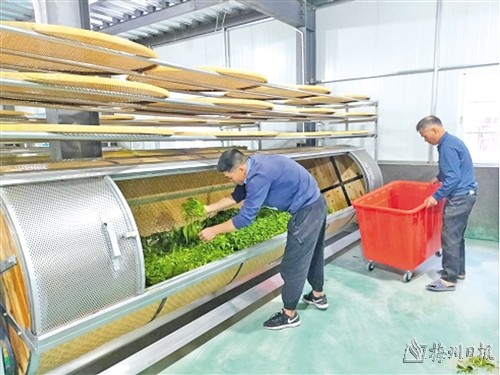 本报讯 近日,五华县棉洋·天池茶叶综合提升示范基地在天柱山下正式投产,厂房内运转着崭新的摇青机、揉捻机、烘干机等,工人们将新鲜采摘的茶叶进行晾晒和摇青,车间里一派热闹的生产景象。