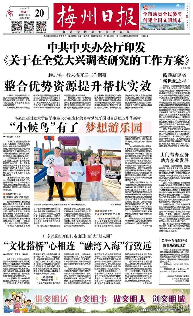 据了解,星火小组是由10名来自江苏、广州、上海、深圳、北京、广西等地区的马来西亚国立大学中国留学生组成,他们从四面八方“奔赴”而来,分工协作,共同为完成乡村梦想乐园项目贡献智慧和力量。其中,留学生刘兆明、闵晓丽和季倩成主要负责跟进梅州五华项目的后续落地情况。