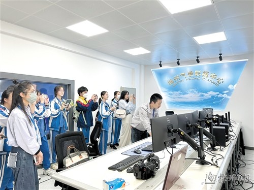 活动中,市气象局工作人员通过播放PPT以及视频的方式,为师生们讲解了梅州气候的基本情况、气象灾害防御等知识,以及天气预报的制作过程,我市气象事业发展的历史和成就。同学们一边仔细聆听,一边认真思考,还时不时地提出问题,工作人员都细心地进行了讲解。随后,师生们来到梅州气象影视中心的演播室,化身气象播报员,体验天气预报节目的播报过程(如上图,张莹娜摄)。师生们还参观了观测站,了解气温、降雨、日照的观测方法以及人工影响天气作业的方式,认识人工增雨发射炮。“这次活动让我能更好地了解气候变化对人类的影响,同时也激发了我对气象科普知识的兴趣。”学生李沁颖说。