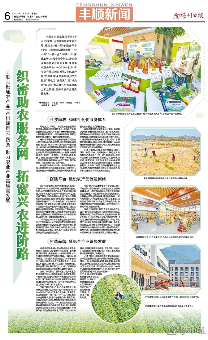 丰顺县以助农服务平台(中心)为载体,全面实施联农带农工程,通过县、镇、村助农服务平台(中心)三级联动,围绕该县“一村一品”“一镇一业”、种养大户、家庭农场、农民专业合作社、涉农企业等新型农业经营主体,搭建助农服务平台(中心)与小农户、专业合作社之间的桥梁,力保农产品“产供储销”全链条畅通,把“好资源”转化为“好品质”,把“好品质”转化为“好品牌”,打响丰顺本土农业品牌,助推农业产业高质量发展。